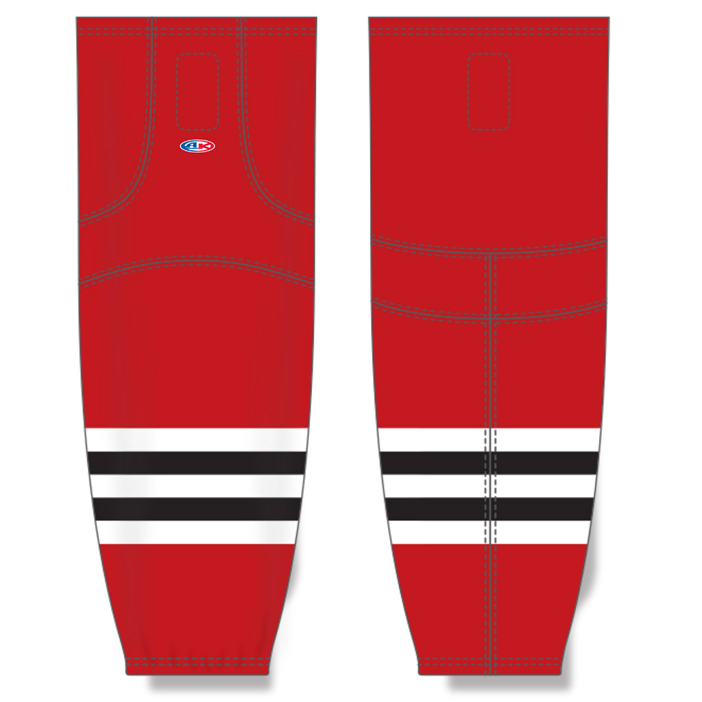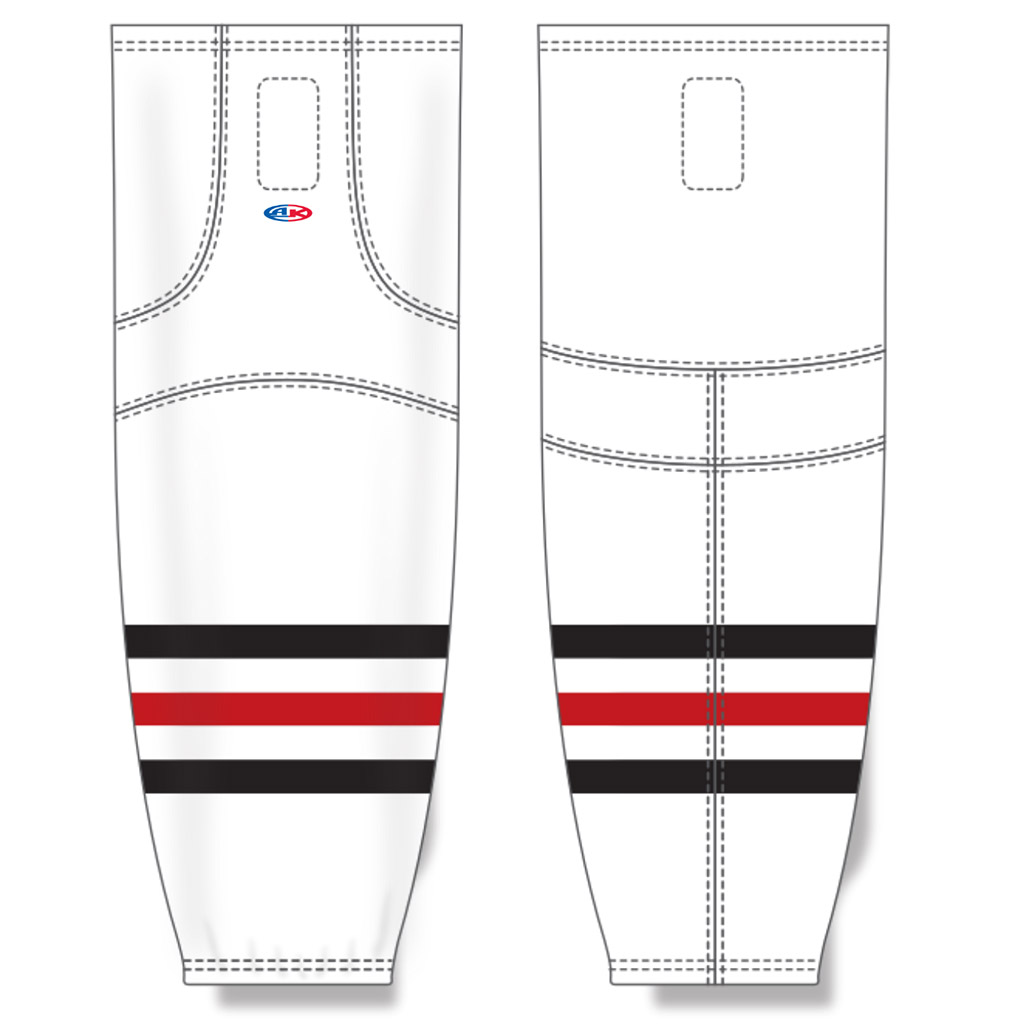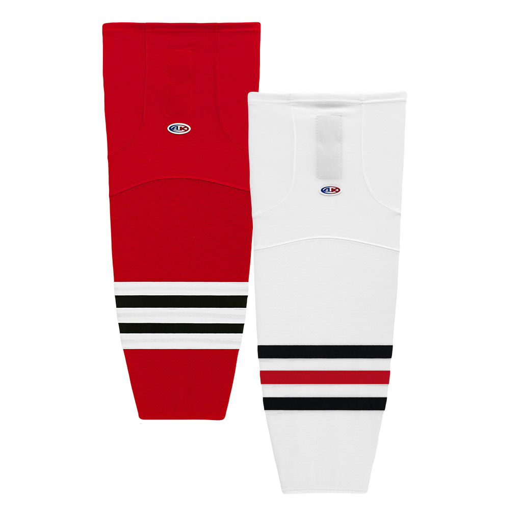 Athletic Knit 100% poly game socks. Velcro tabs. Available in white or red Chicago pattern to match TRBH game jerseys.